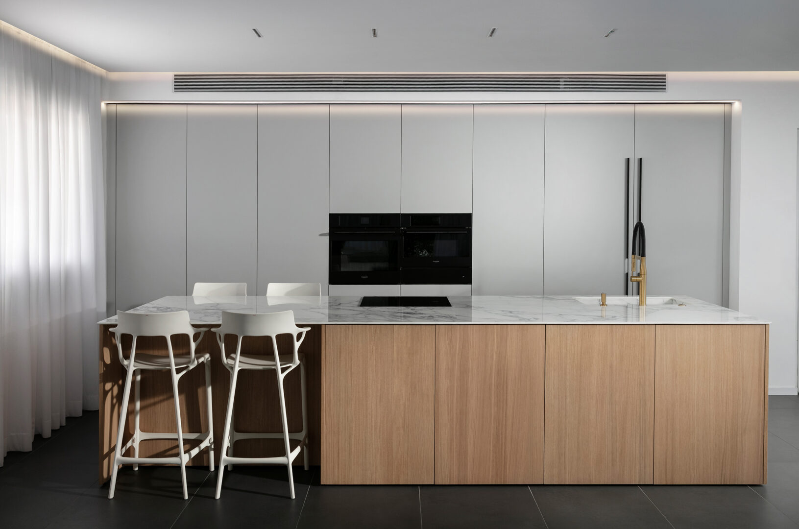אי רחב ידיים במקביל לשטחי האחסון במטבח, בגימור פורניר אלון אירופי לבן שטרייף מצדו האחד, ומצדו השני, שסמוך לארונות, בגוון אפור בהיר מעניק תחושת חמימות לחלל הבהיר. משטח העבודה, בדמות גרניט פורצלן לבן עם נימים עדינים, מוסיף לתחושת היוקרה והאלגנטיות בחלל.