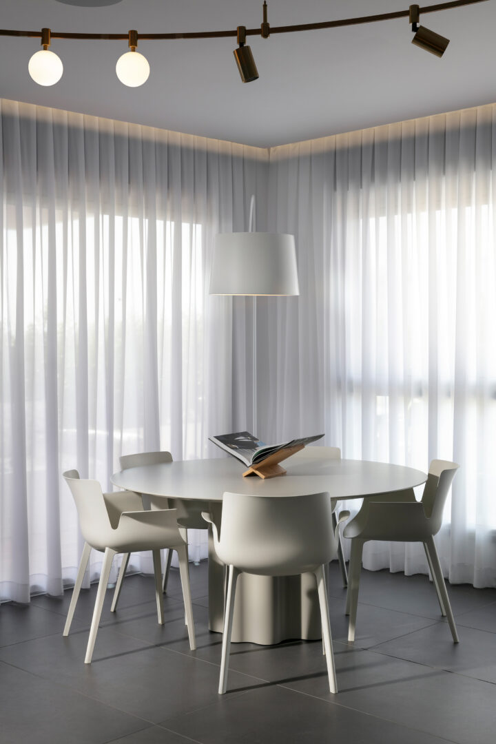 פינת האוכל העגולה מפארת את קצה החלל. היא מורכבת משולחן בהיר עם רגל דמוית פרח, סביבה כיסאות שמשלימים את המעגל. במרכז הוצב מעמד ספרים מעץ שמזכיר צורת ציפור פרושת-כנפיים. במקום לבחור בגוף תאורה מסורתי המשתלשל מהתקרה, בחר מילשטיין להציב גוף תאורה עומד. "אני לא אוהב שיש 'תחרות' בין גופי תאורה בחלל", הוא אומר. "לכן העדפתי מנורה עומדת עם בסיס רצפתי, שהאהיל שלה מעניק תחושה אינטימית. בנוסף, היא גם מודולרית ואפשר להזיז אותה לאן שרוצים".