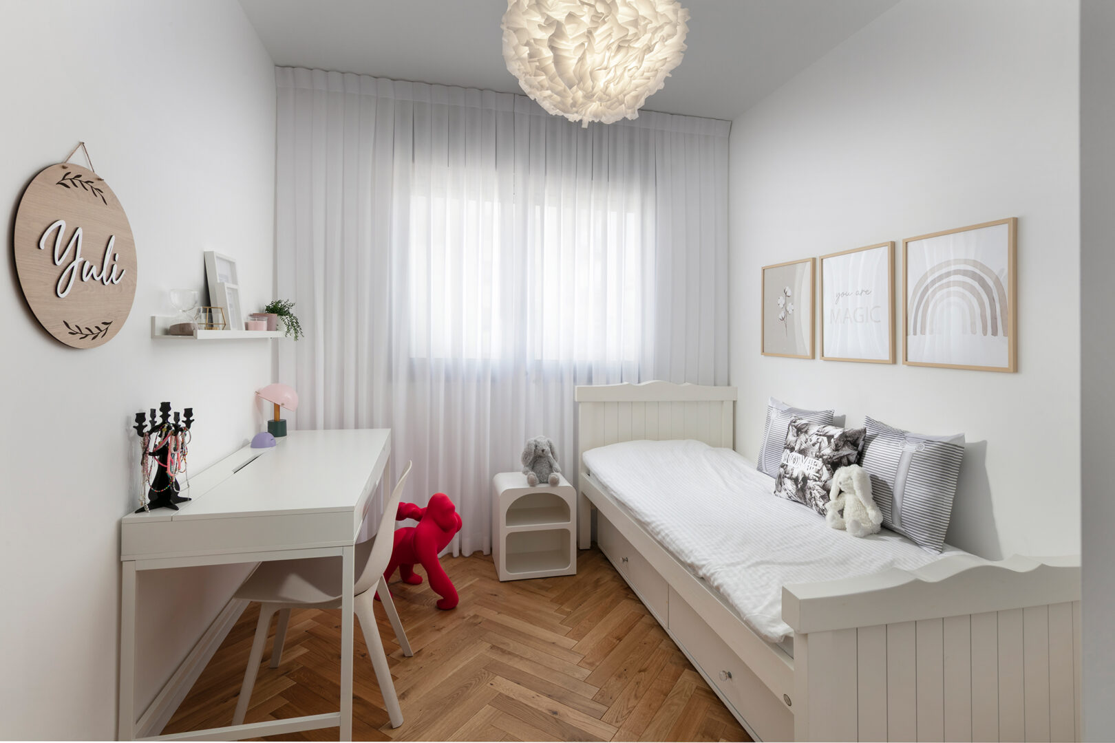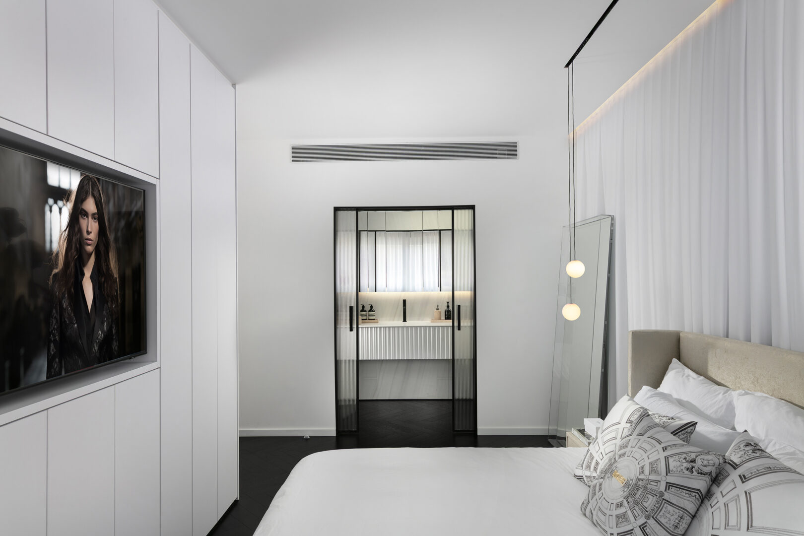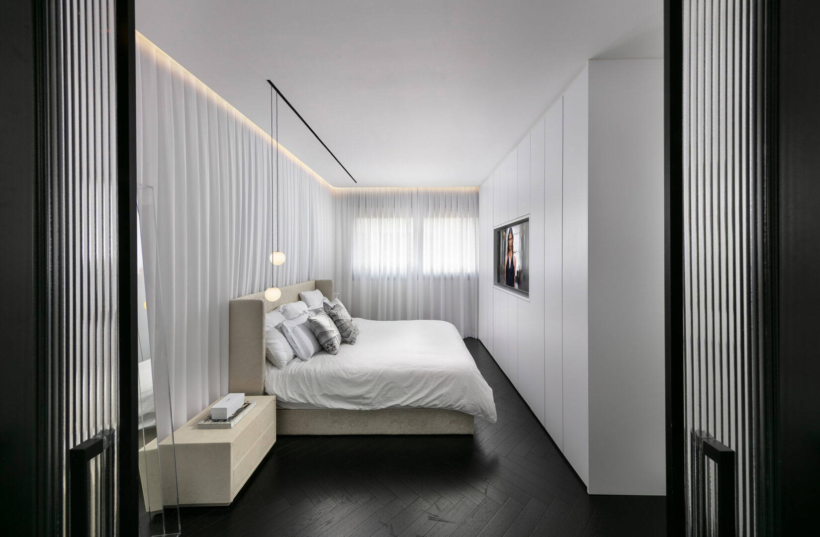 לכל אחת מהבנות תוכנן חדר משלה, עם רהיטים ופריטים מותאמים אישית. הקו העיצובי של הבית נשמר וכמו משוכפל בחדרים, תוך הצגת חללים קסומים ובהירים, עם הבלחות עץ חמימות. גם סוויטת ההורים עברה שינוי מהותי: במקום חדר "קובייתי" שבו חדר ארונות קטן וחדר רחצה סטנדרטי, הפך מילשטיין את החדר למלבני, תוך שהוא מבטל את חדר הארונות ומרחיב את חדר הרחצה בצורה אופקית. הודות לשינוי צורת החדר, הוא הפך לרחב ונינוח מכפי גודלו. במרכזו ניצבת מיטה זוגית עם מראשות שכמו מחבקות אותה, מחופה בבד מיוחד של ז'אן פול גוטייה, שיובא במיוחד מחו"ל. פס תאורה מעל מאפשר להזיז את גופי התאורה שמשתלשלים ממנו, לכיוון הרצוי. מול המיטה ארון גדול ונוח לשימוש, שבמרכזו מסך טלוויזיה. חדר רחצה נחשף בעזרת שתי דלתות כיס עשויות מזכוכית גלינה מחורצת וממוסגרות בפרופיל שחור דקיק. החלל עוצב בצורה אלגנטית וסקסית, בעזרת חיפויי גרניט בגוון פחם ונימים עדינים, תאורה מוסתרת סביב המראה העגולה, וארון לבן כקונטרסט, בגימור מחורץ. "היה לי חשוב להפוך את החלל הסטנדרטי והבנאלי לסוויטה אינטימית ומפנקת", מוסיף המעצב. "התוצאה היא מרחב נינוח ואישי, שמשלב פונקציונליות עם תחושת יוקרה של חדר מלון".