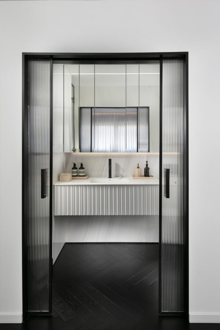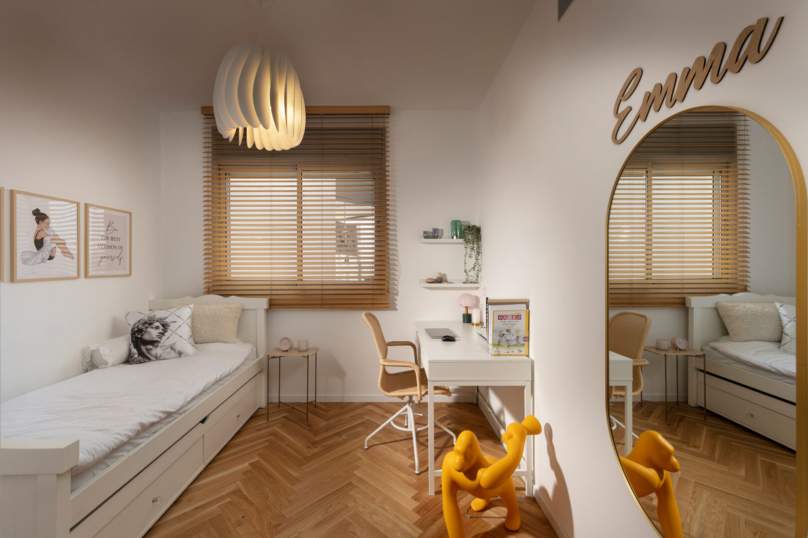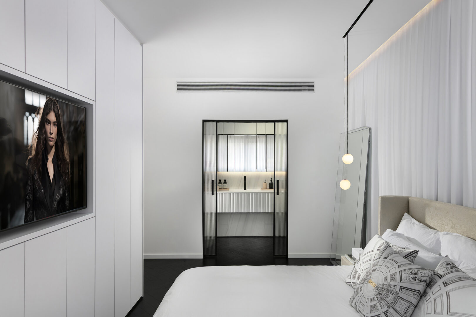 לכל אחת מהבנות תוכנן חדר משלה, עם רהיטים ופריטים מותאמים אישית. הקו העיצובי של הבית נשמר וכמו משוכפל בחדרים, תוך הצגת חללים קסומים ובהירים, עם הבלחות עץ חמימות. גם סוויטת ההורים עברה שינוי מהותי: במקום חדר "קובייתי" שבו חדר ארונות קטן וחדר רחצה סטנדרטי, הפך מילשטיין את החדר למלבני, תוך שהוא מבטל את חדר הארונות ומרחיב את חדר הרחצה בצורה אופקית. הודות לשינוי צורת החדר, הוא הפך לרחב ונינוח מכפי גודלו. במרכזו ניצבת מיטה זוגית עם מראשות שכמו מחבקות אותה, מחופה בבד מיוחד של ז'אן פול גוטייה, שיובא במיוחד מחו"ל. פס תאורה מעל מאפשר להזיז את גופי התאורה שמשתלשלים ממנו, לכיוון הרצוי. מול המיטה ארון גדול ונוח לשימוש, שבמרכזו מסך טלוויזיה. חדר רחצה נחשף בעזרת שתי דלתות כיס עשויות מזכוכית גלינה מחורצת וממוסגרות בפרופיל שחור דקיק. החלל עוצב בצורה אלגנטית וסקסית, בעזרת חיפויי גרניט בגוון פחם ונימים עדינים, תאורה מוסתרת סביב המראה העגולה, וארון לבן כקונטרסט, בגימור מחורץ. "היה לי חשוב להפוך את החלל הסטנדרטי והבנאלי לסוויטה אינטימית ומפנקת", מוסיף המעצב. "התוצאה היא מרחב נינוח ואישי, שמשלב פונקציונליות עם תחושת יוקרה של חדר מלון".