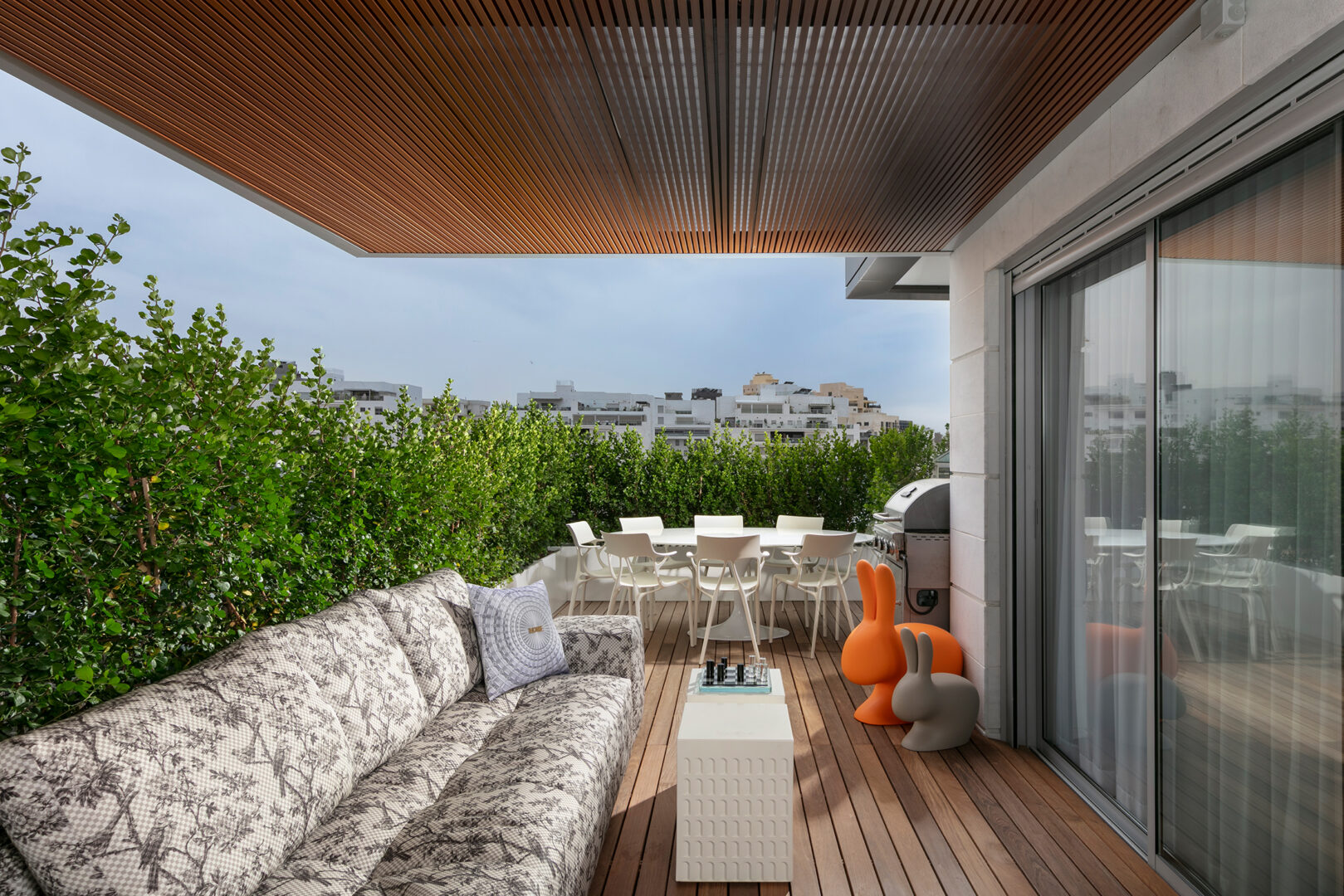 המרפסת הרחבה, שמשתרעת על פני 30 מ"ר, אמנם צופה אל בניינים, אבל מילשטיין תכנן אותה כך שתשמור על פרטיות. הודות לצמחיה היקפית ולפרגולת עץ היא הופכת לגינה קסומה בין בניינים. "תכננתי אותה כחלל חוץ אלטרנטיבי עם פינת אוכל, פינת ישיבה ומקום לברביקיו", הוא מסביר. "בעל הבית מבלה כאן שעות רבות, משתמש בחלל כפינת עבודה יצירתית, וזה הפך למעין בית שני וקסום עבור בני הבית כולם".