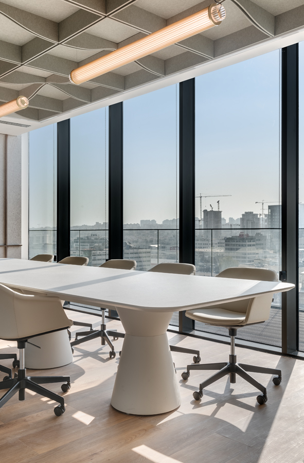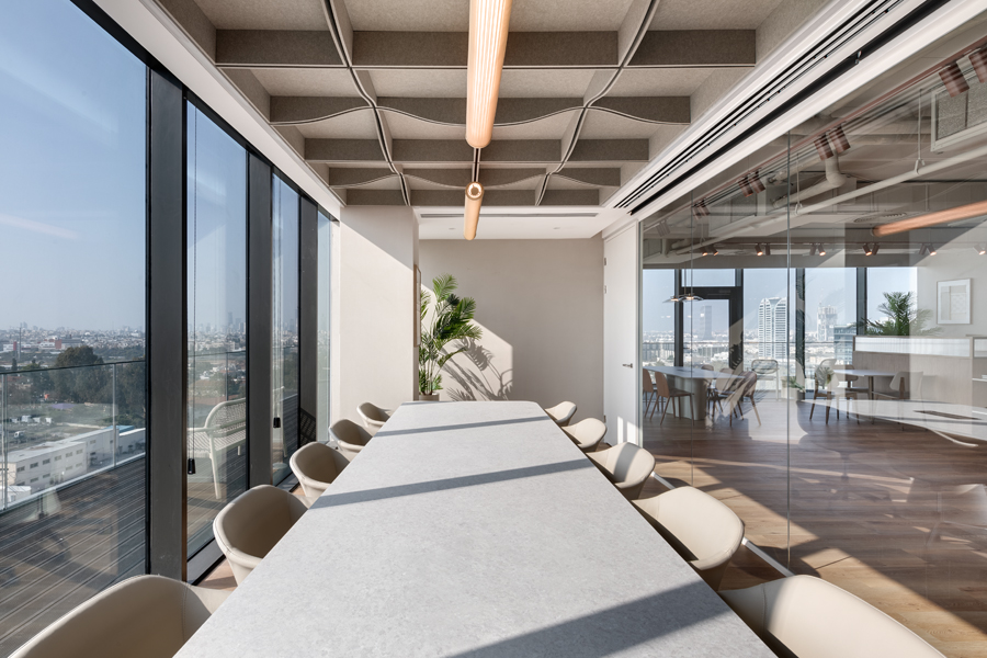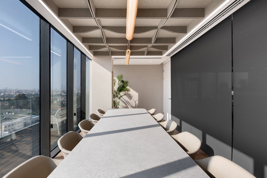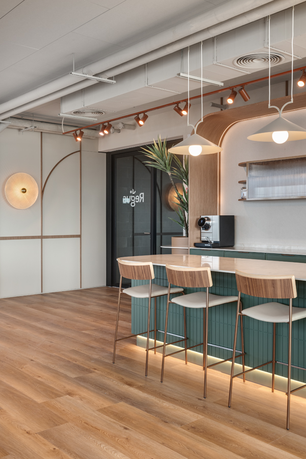 בחירת החומרים מדגישה את השפה הזו. נעשה שימוש רב בעץ בגוונים חמים – בפרקט, בנגרות ובמחיצות – לצד פלטת צבעים טבעית בגוונים בהירים וחוליים. לצידם שולבו גוונים ירוקים בתתי גוונים שונים: ירוק דומיננטי בקפיטריה ותקרות בגוון זית בחדרי הישיבות. השילוב בין החומרים, הגמרים והגוונים יוצר חלל שמרגיש טבעי גם כשהוא אורבני, יוקרתי גם כשהוא מאופק, ומעורר השראה דרך השקט שבו.
