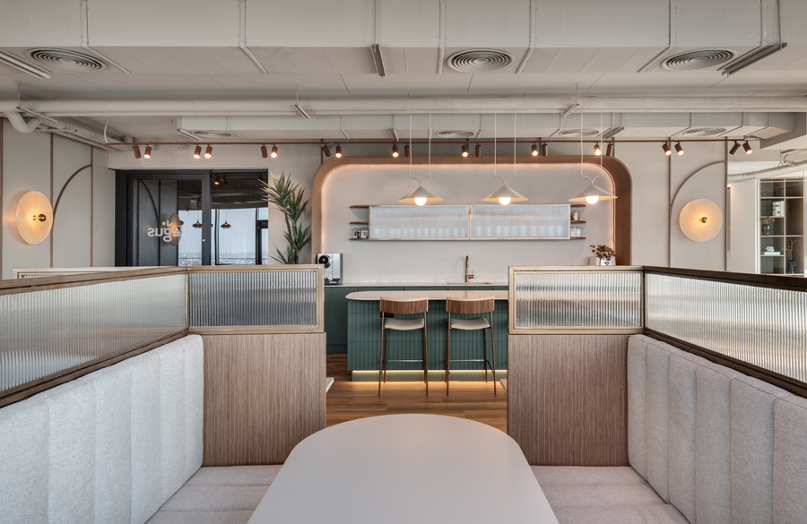 פינות הישיבה בחלל תוכננו בנגרות מיוחדת, כך שהן מאפשרות תחושת פרטיות תוך שמירה על חיבור לזרימה הכללית של החלל. הספסלים המובנים משני צדי השולחנות יוצרים ישיבה פנים אל פנים, המעודדת אינטראקציה ומתאימה לפגישות קצרות, כאשר התחושה הכללית מזכירה יותר לאונג’ או בית קפה מאשר משרד קלאסי. הפינות ממשיכות את השפה החומרית עם ריפודים בגווני שמנת ובז’, נגרות עץ בגוון טבעי ושילוב של זכוכית וטקסטיל, המאזנים בין שקיפות לאינטימיות.