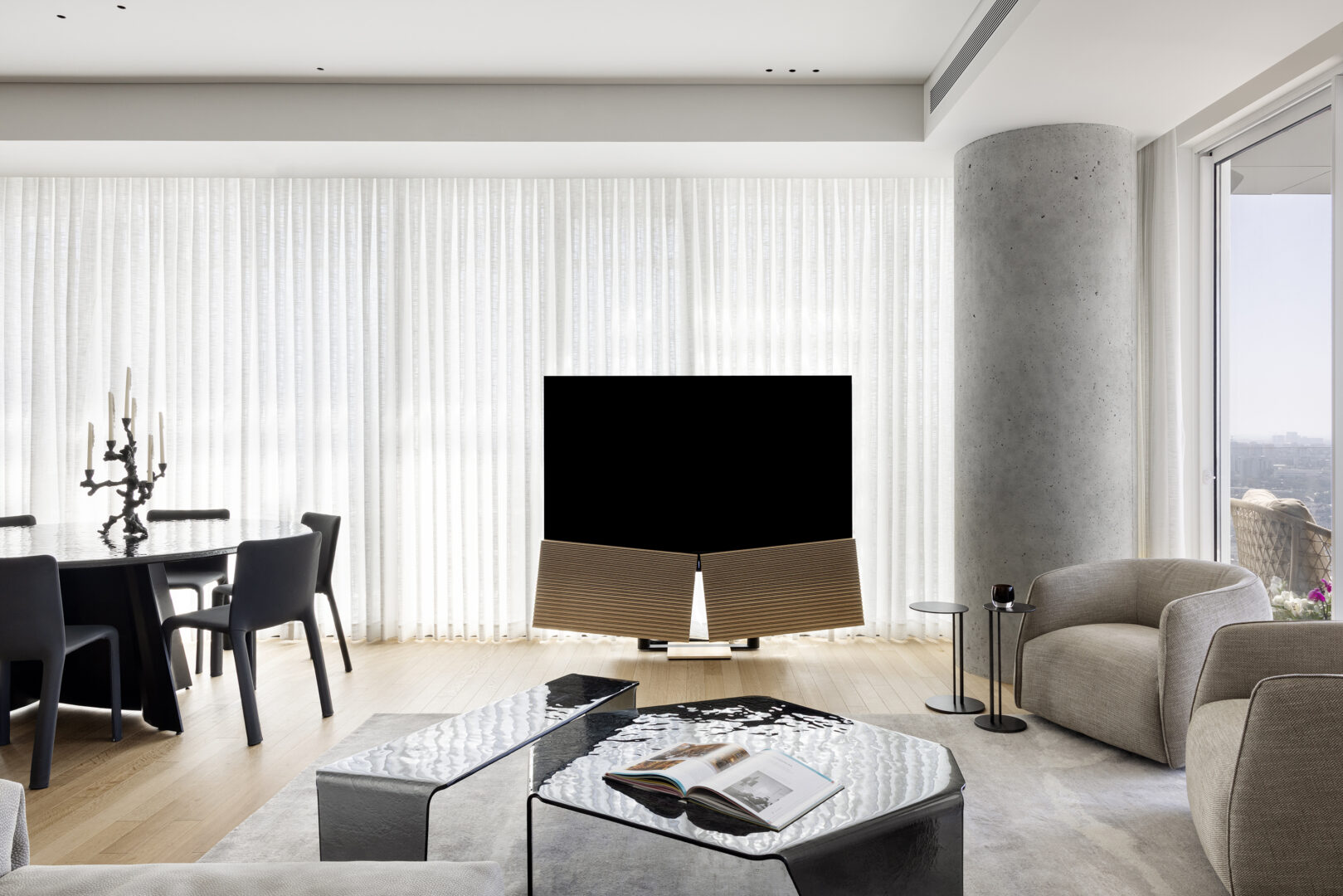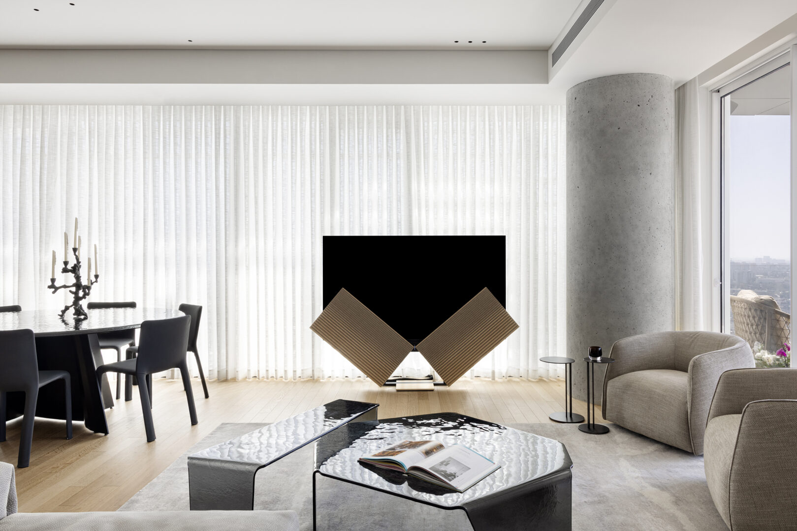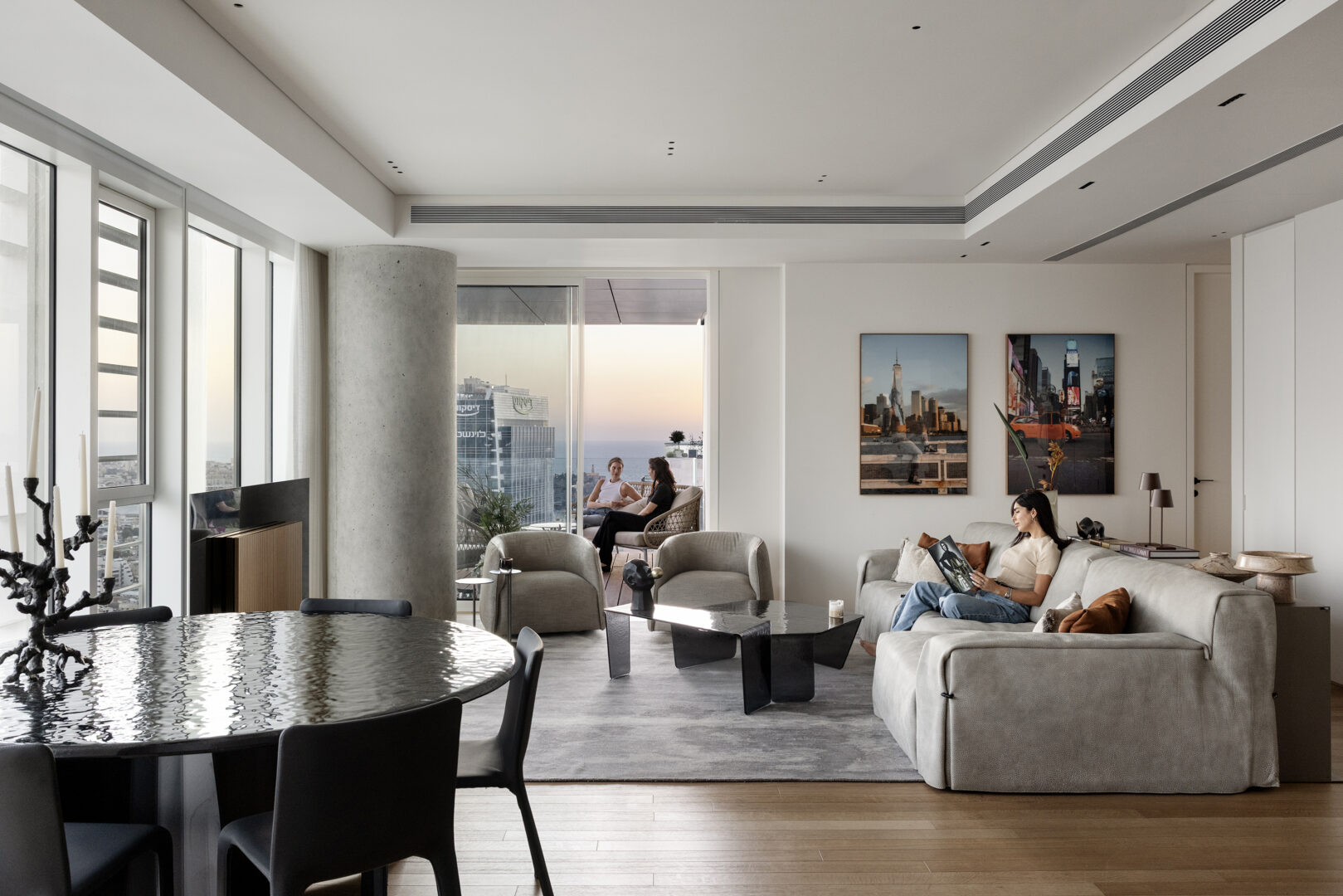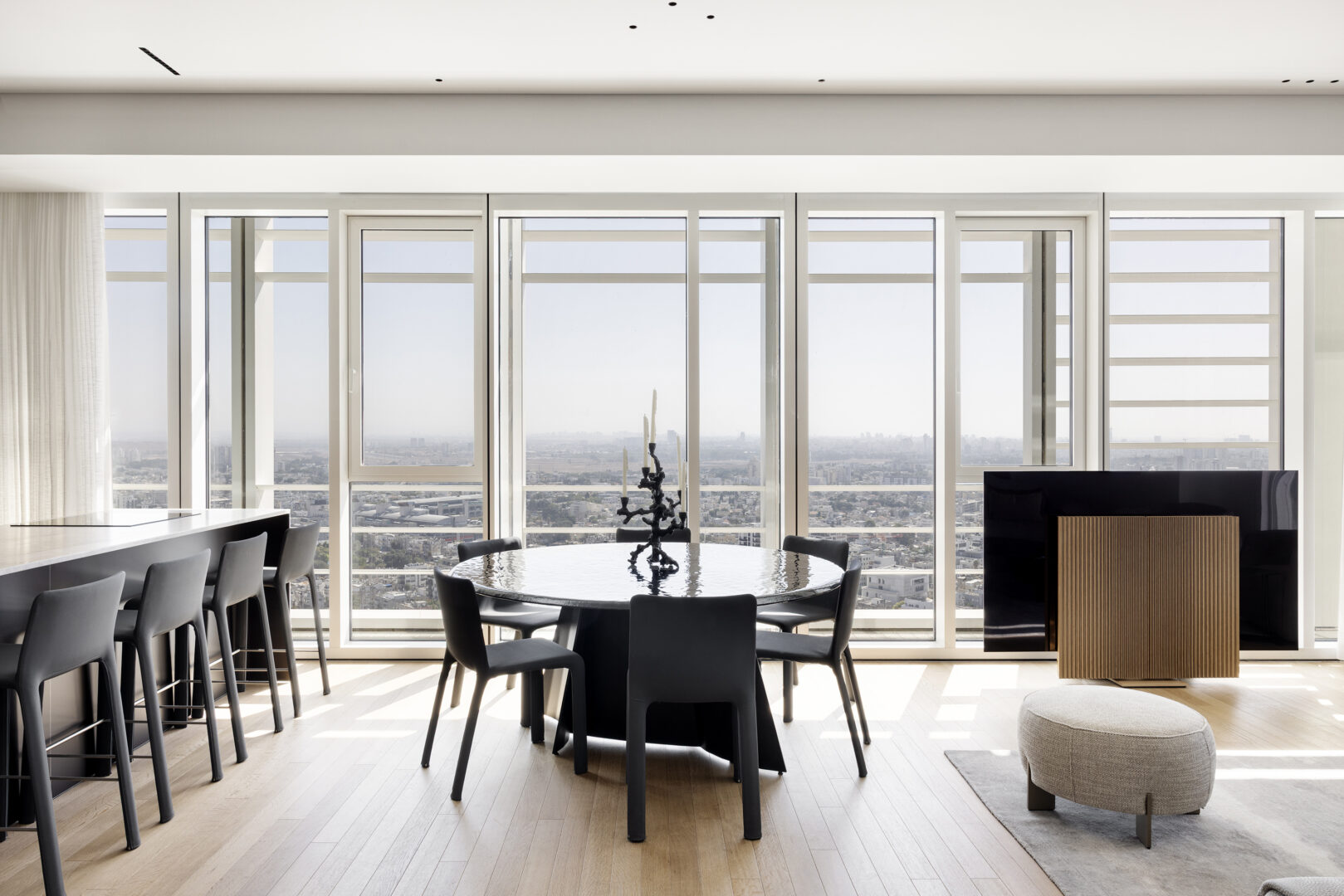 נקודת המוצא לתכנון הייתה הנוף. בגובה כזה, הנוף אינו רק אלמנט אסתטי אלא מרכיב מרכזי בחוויית המגורים. בהתאם לכך, כל החלטה תכנונית התקבלה מתוך מטרה אחת ברורה: להפנות את החיים פנימה אל קו האופק. אזור הישיבה מוקם כך שהמבט פונה ישירות החוצה, צירי התנועה תוכננו כדי לאפשר מבטים פתוחים, והחלל כולו מתנהל בדיאלוג מתמשך עם האור המשתנה לאורך היום.