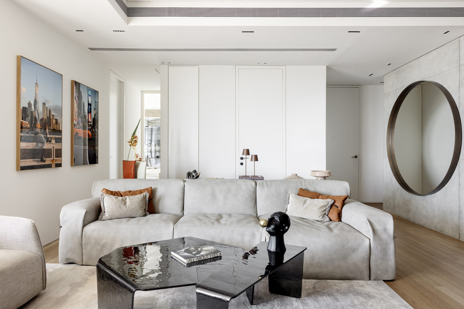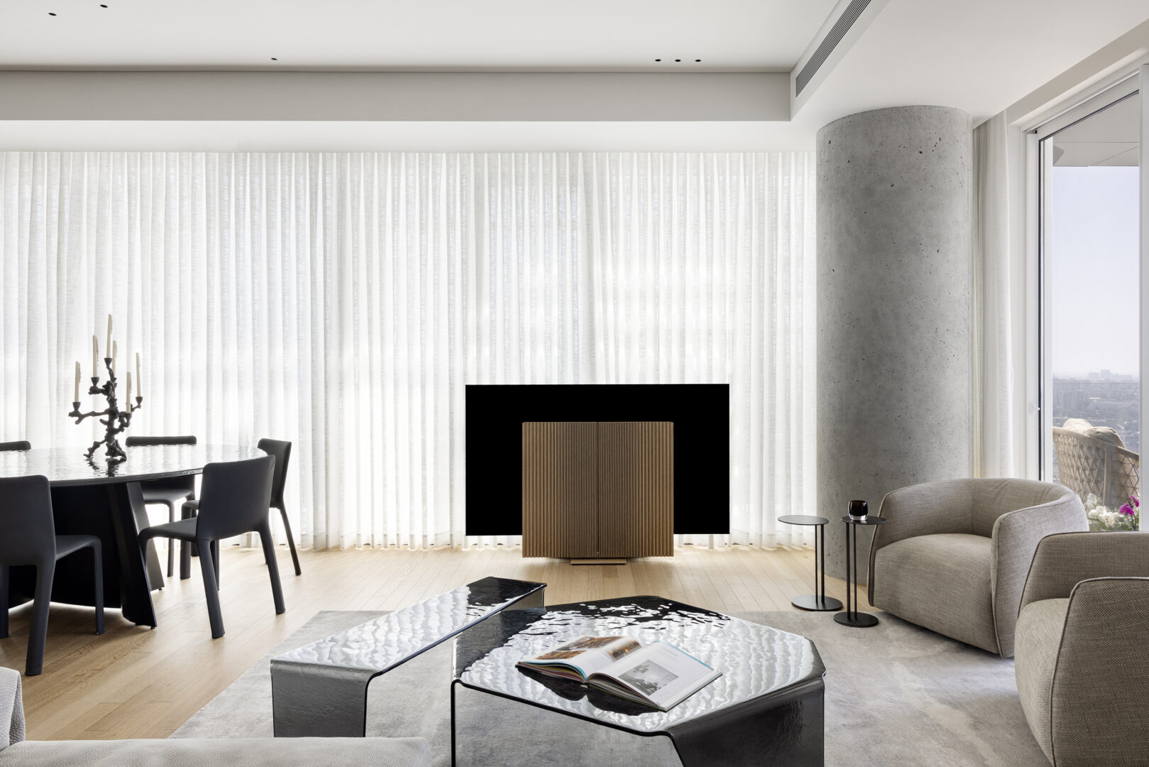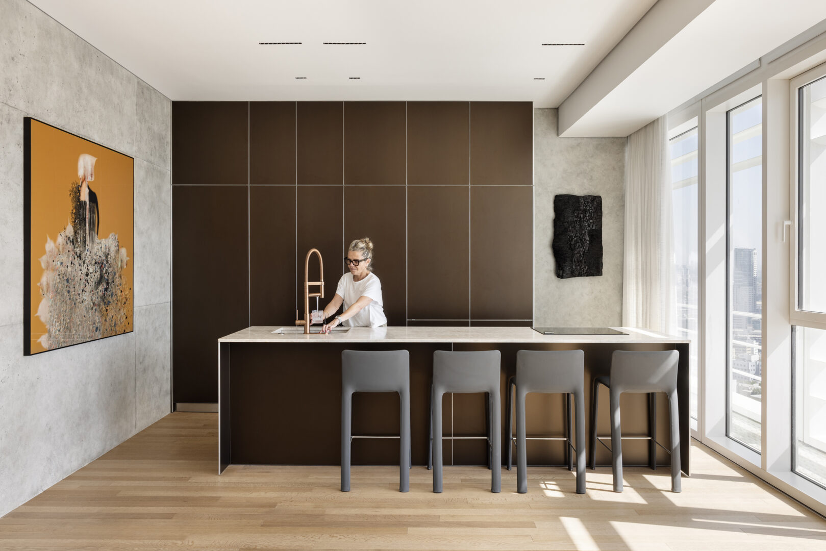 בקומה ה־30 של מגדל בשדרות רוטשילד בתל אביב, מול המפגש שבין קו הרקיע לים, תכננה ועיצבה מעצבת הפנים צביה קזיוף דירת ארבעה חדרים עבור גרוש תל-אביבי. הדירה, בשטח של כ־150 מ"ר עם מרפסת של 6 מ"ר, מבטאת תפיסת חיים עירונית בוגרת ומדויקת, כזו שאינה מנסה לברוח מהעיר אלא להפך – לחיות אותה במלוא העוצמה.