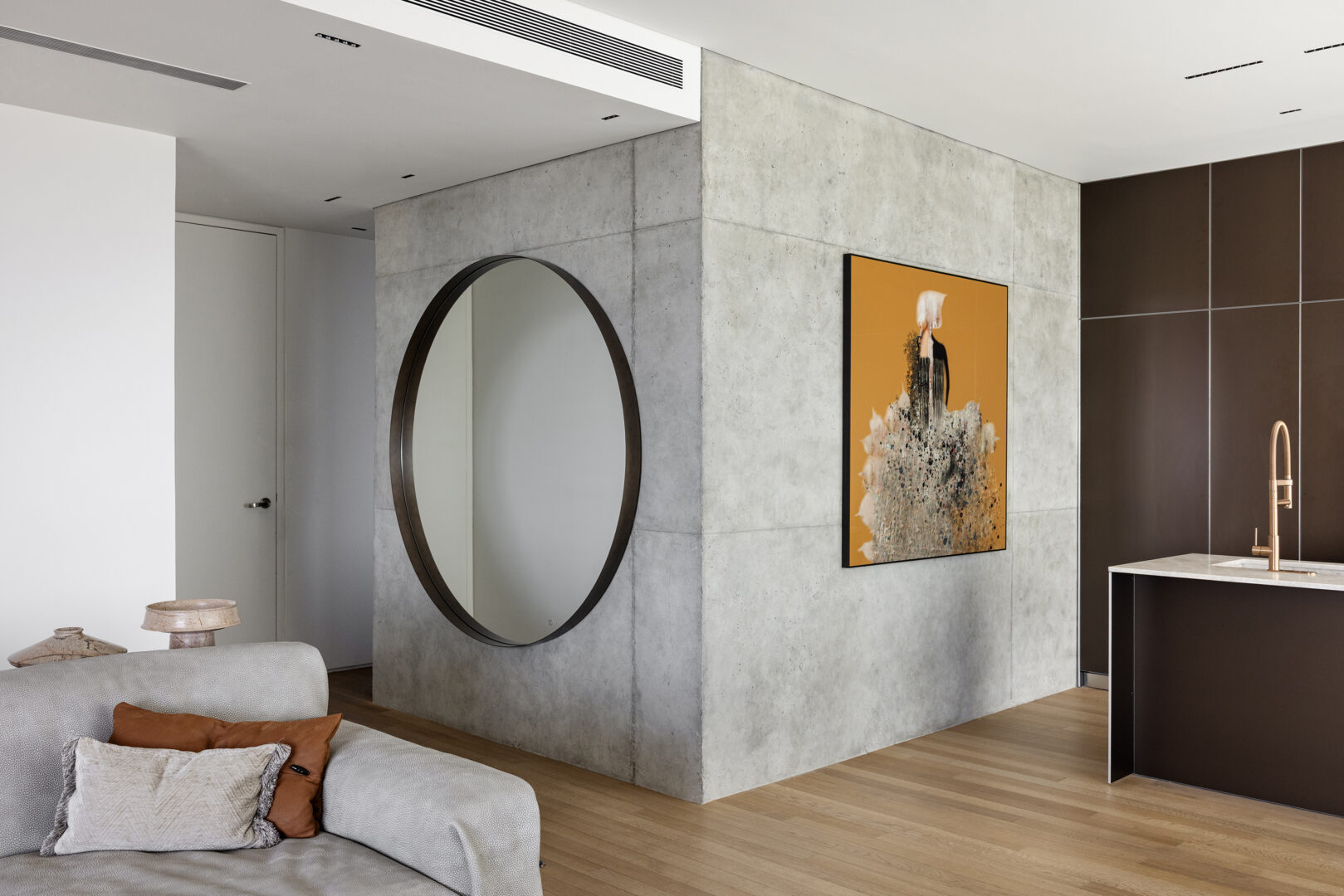הקונספט העיצובי משלב מודרניות, נגיעות קלאסיות וטאץ’ תעשייתי, תוך שימוש בחומרי גלם אותנטיים כמו בטון חשוף, מתכת, עץ וזכוכית. במהלך העבודה נחשפו אלמנטים מבטון שהפכו לחלק בלתי נפרד מהשפה העיצובית, והעניקו לדירה תחושה כנה ולא מתאמצת. מולם שולבו רצפת עץ ורהיטים בעלי נוכחות, שמוסיפים חום ואיזון, לצד אלמנטים מתכתיים שמגיבים לאור ומשתנים יחד איתו.