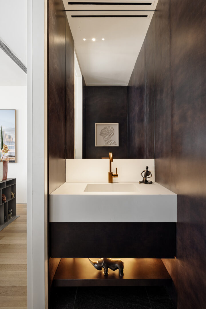 גם חדר הרחצה הצמוד לסוויטה תוכנן מתוך אותה גישה של דיוק וניקיון צורני. נישה ארוכה ורציפה נבנתה מהכיור ועד המקלחון, ומאפשרת אחסון פונקציונלי לצד מראה נקי ואחיד. התכנון הקפדני יוצר תחושה רגועה ומדויקת, שבה כל פרט נמצא במקומו.