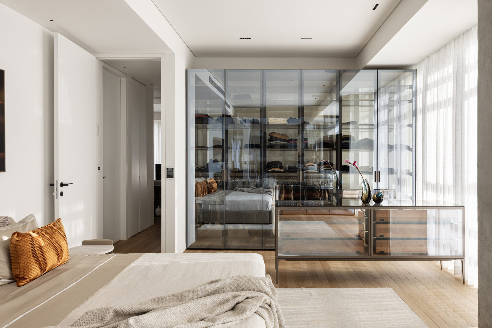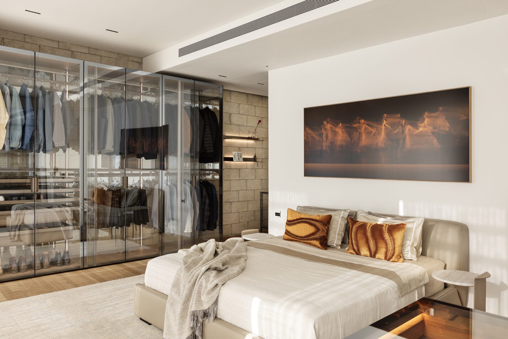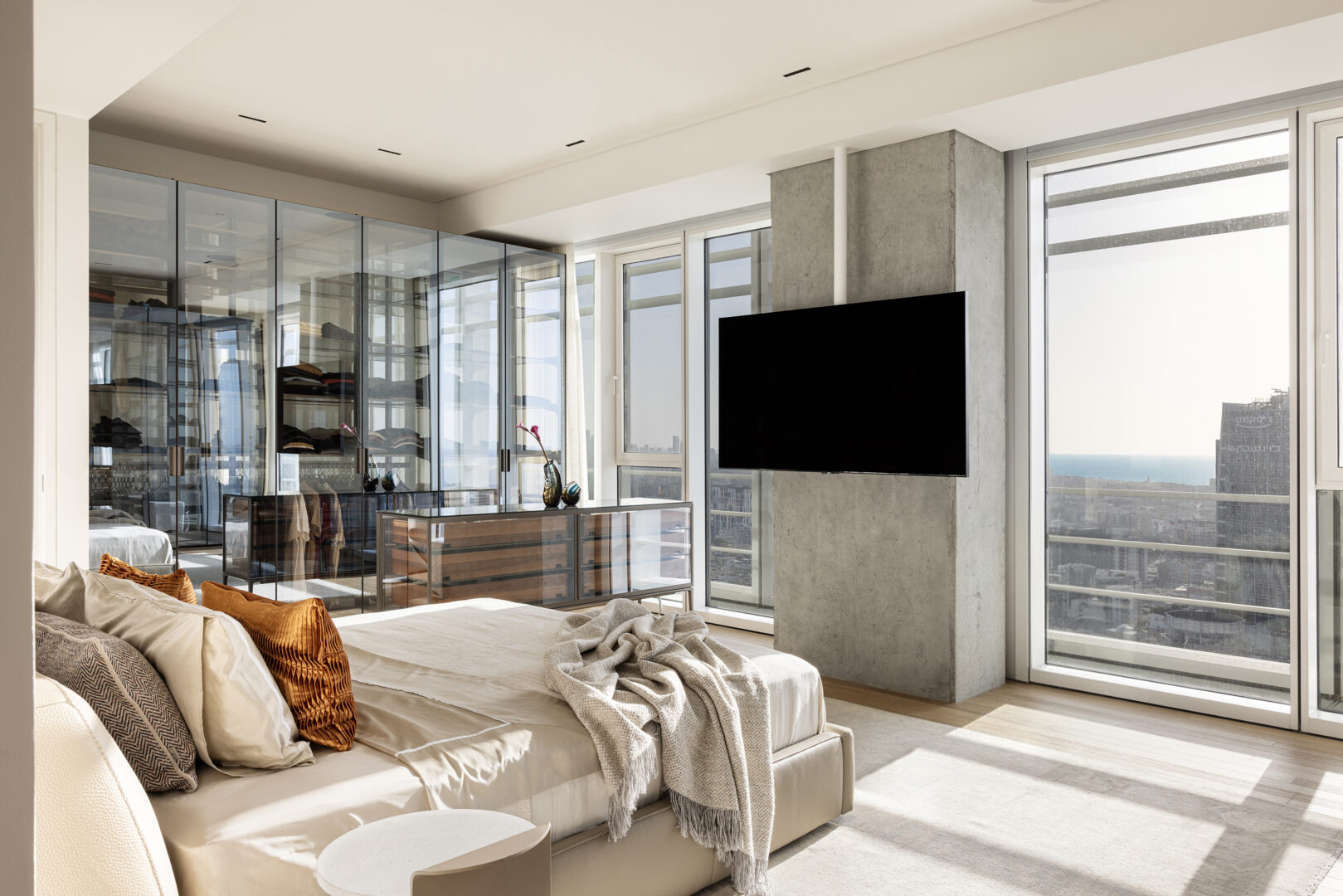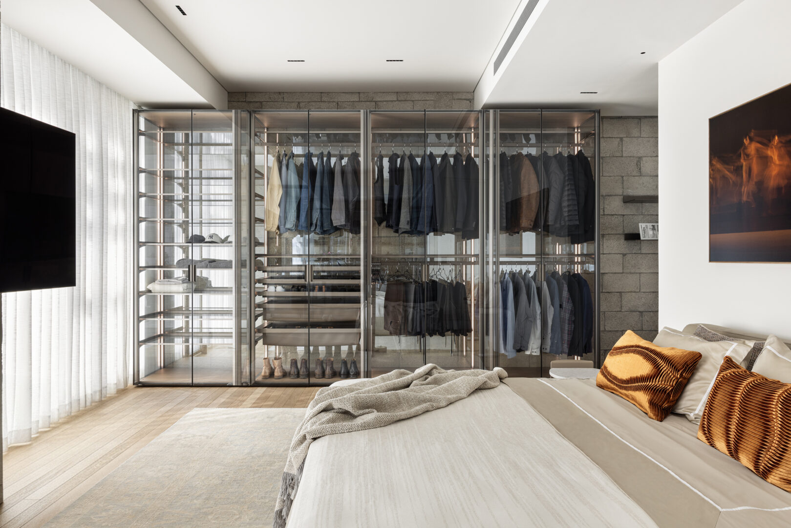 אלמנט מרכזי בסוויטה הוא הארון, שתוכנן כמערכת אחסון אדריכלית ולא רק כרהיט. הארון משלב מתכת וזכוכית, ומצליח מצד אחד להגדיר פונקציה ברורה, ומצד שני לשמור על קלילות ויזואלית. הבחירה בזכוכית מאפשרת תחושת עומק ושקיפות, ומונעת מהארון להפוך לגוש כבד וסגור בתוך החלל. המתכת, שמגיבה לאור הטבעי, ממשיכה את הקשר בין החומרים לבין הדינמיקה של היום, ומחזקת את הקו התעשייתי המעודן שמלווה את הדירה כולה.