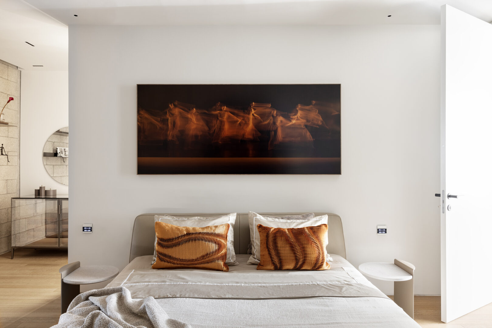 סוויטת השינה תוכננה כמרחב פרטי, שקט ומדויק, הממשיך את השפה החומרית של הדירה אך בפרשנות מרוככת ואינטימית יותר. הקירות שומרים על החומריות האותנטית, בעוד שרצפת העץ מאזנת ומוסיפה חמימות. הסוויטה אינה עמוסה, אלא מתמקדת בפרופורציות, במבט החוצה ובתחושת מרחב נקייה.