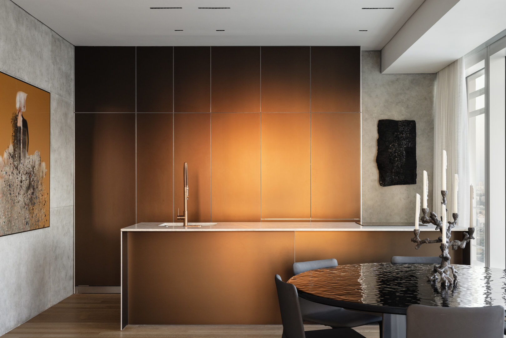 אחד המוקדים המשמעותיים בדירה הוא המטבח, שחופה במתכת בעלת גוון משתנה. במהלך היום הוא מקבל אופי אחר בהתאם לזווית האור, והופך לאלמנט חי ודינמי בתוך החלל. גם החלל הציבורי, הכולל את הסלון והמרפסת, תוכנן כרצף אחד פתוח המאפשר אירוח, תנועה ומבט מתמשך אל העיר. הגבול בין פנים לחוץ מטשטש, והמרפסת הופכת להמשך טבעי של אזור המגורים ומבטאת אורח חיים תל אביבי דינמי ומחובר לסביבה.