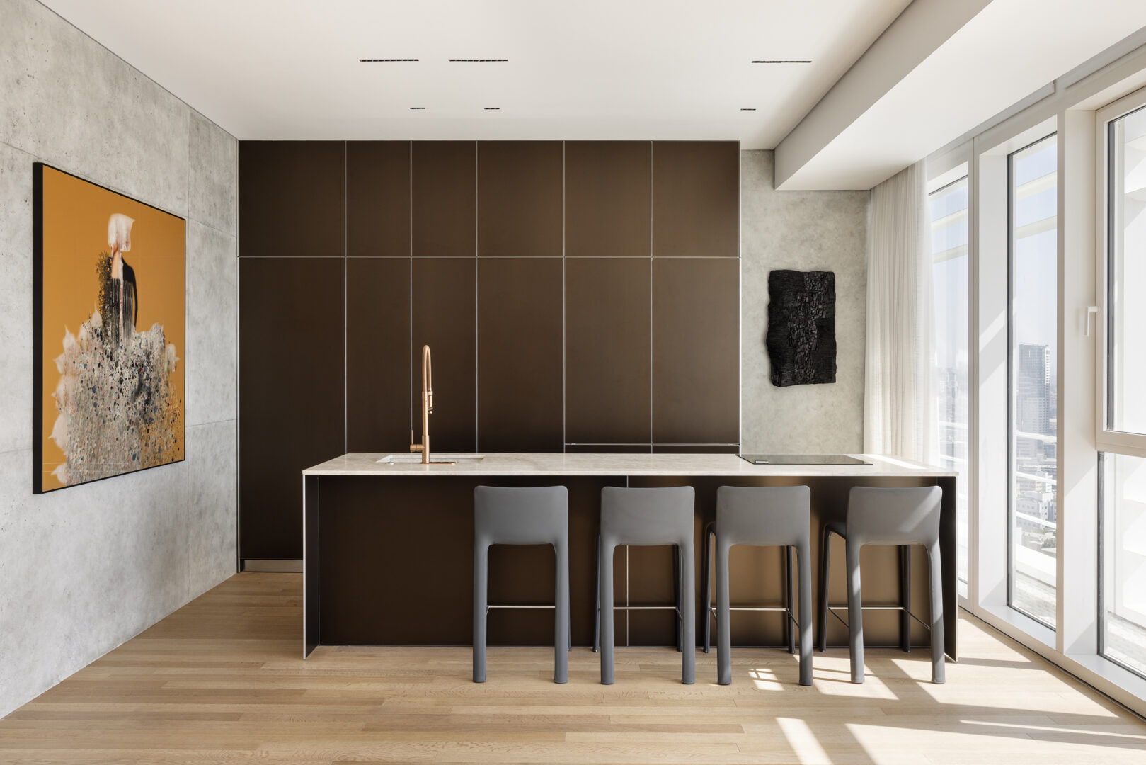 התוצאה היא דירה שמצליחה לשקף את אופייה של תל אביב דרך חומר, אור ומרחב. היא אינה מנסה לרכך את העיר או להתנתק ממנה, אלא להפך – לאמץ את האנרגיה שלה, את הישירות ואת הכנות. זהו מרחב מגורים שמבין את מקומו, בגובה, בעיר, ובחייו החדשים של הדייר עבורו תוכנן.