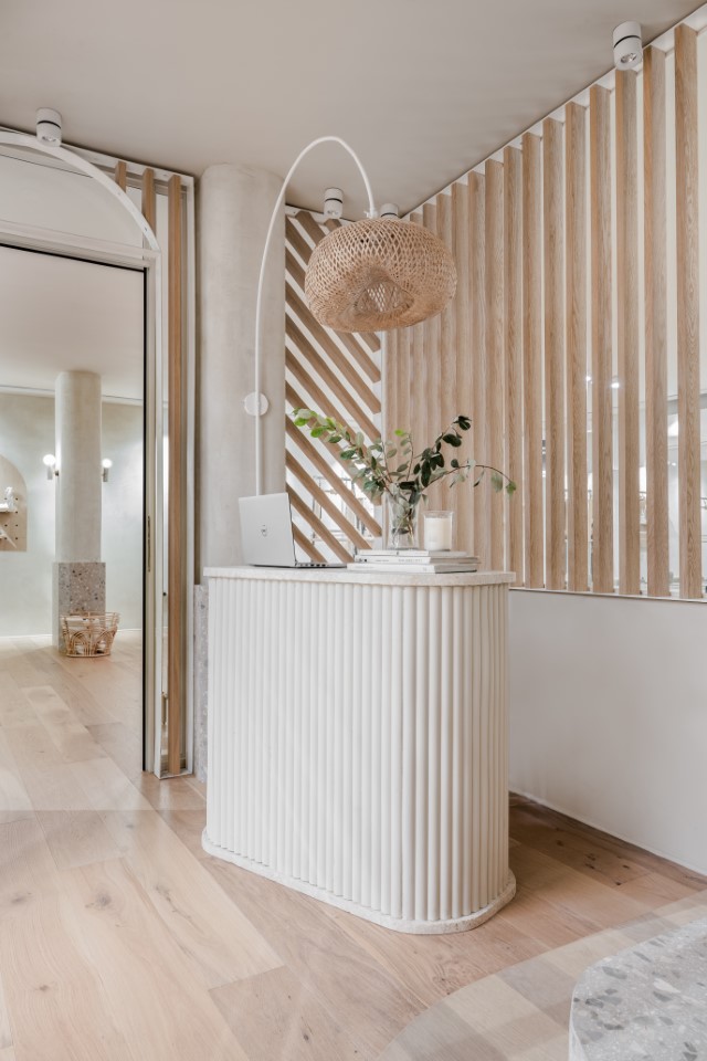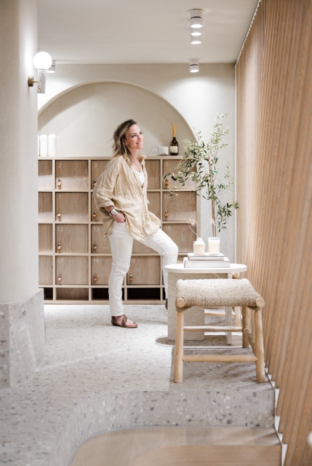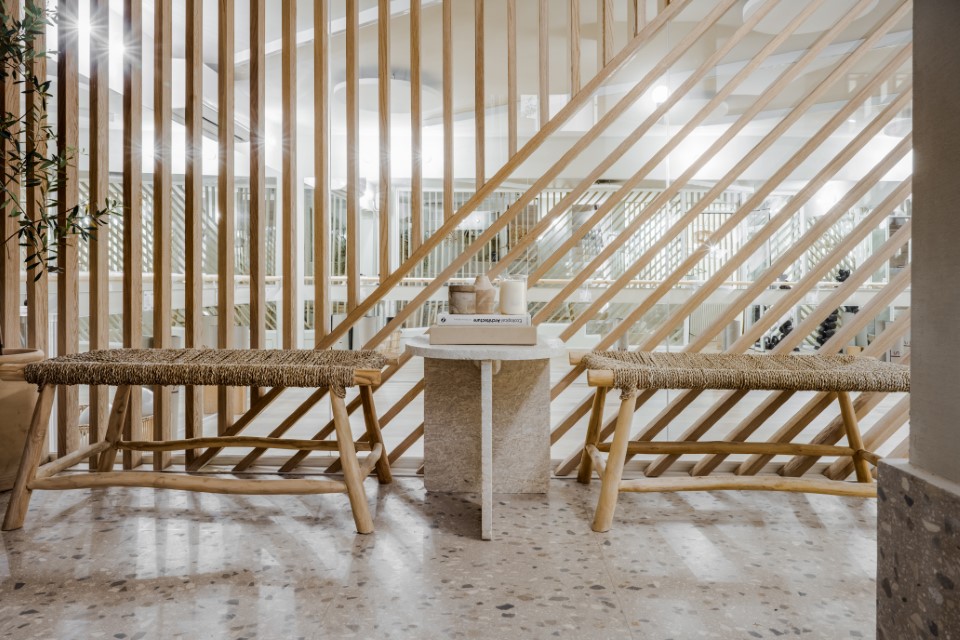 השפה החומרית והצבעונית של הפרויקט נשענת על פלטה טבעית ובהירה. גווני עץ חמים דומיננטיים בחלל, ומשולבים עם בטון בהיר, קירות בגווני שמנת ורצפת עץ טבעי. הצבעוניות המונוכרומטית והרכה נועדה לייצר רקע שקט שאינו מתחרה בתנועה האנושית, אלא תומך בה ומעצים אותה. הבחירה בחומרים טבעיים יוצרת תחושת קרקע, יציבות וחיבור לגוף, ומתרחקת מאסתטיקה סטרילית או קרה.