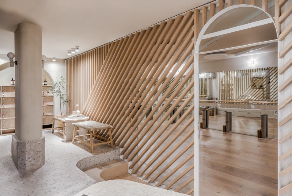 אלמנט אדריכלי מרכזי בפרויקט הוא מערכת מחיצות עץ אלכסוניות, הפועלות כאלמנט פיסולי המגדיר את החלל מבלי לחלקו באופן נוקשה. המחיצות יוצרות אזורי תרגול, שהייה ומעבר, מאפשרות חדירת אור וקשר עין, ומעניקות לחלל תחושת תנועה ודינמיקה המתכתבת עם אופי הסטודיו. הזוויות האלכסוניות והקצב החוזר שלהן מייצרים תחושת המשכיות ומוסיפים רובד חזותי עמוק, גם כאשר החלל שקט וריק.