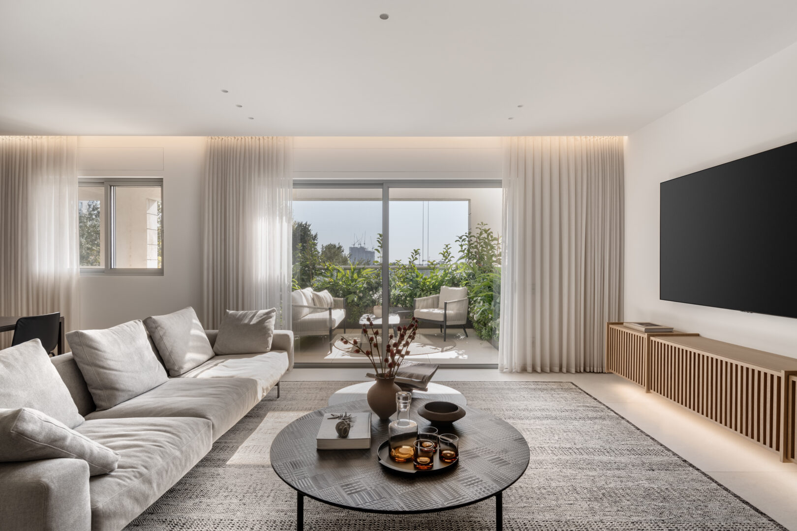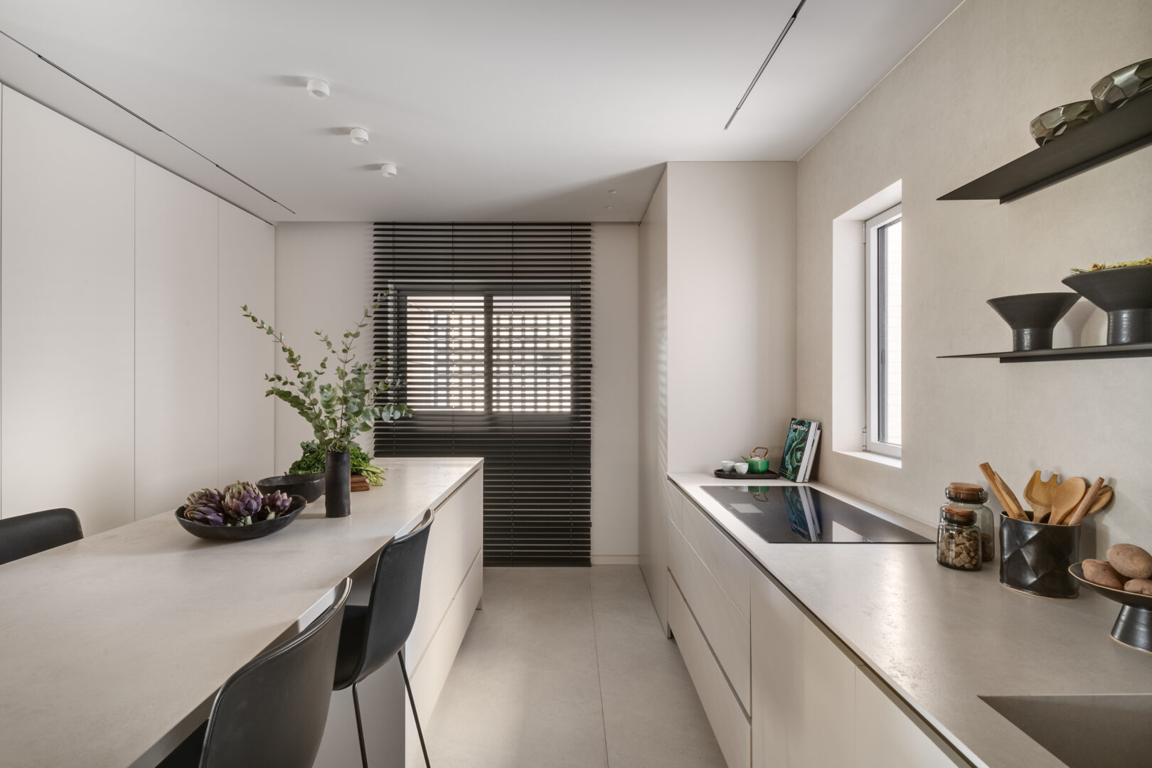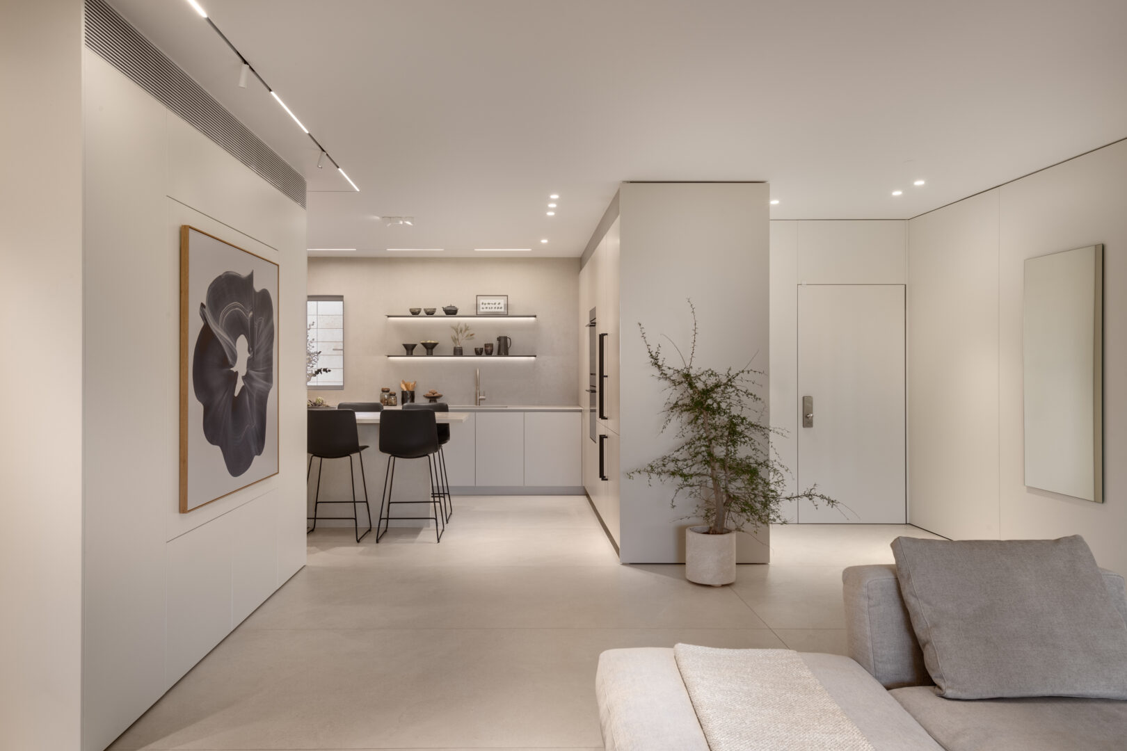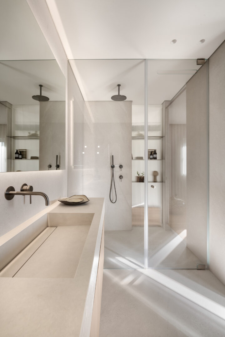 הדירה מלאה בפרטים קטנים שמספרים את הסיפור האמיתי של הפרויקט: דלתות קו אפס בגובה תקרה, חיפויי קיר הממשיכים מעל דלת הממ”ד ומטשטשים את נוכחותה, אריחי בטון תלת־ממדיים בחדר הרחצה ובשירותי האורחים, מדפי ברזל דקיקים עם תאורת לד אינטגרלית במטבח, ופרטי נגרות מדויקים שנבנו במיוחד עבור כל אזור בבית.