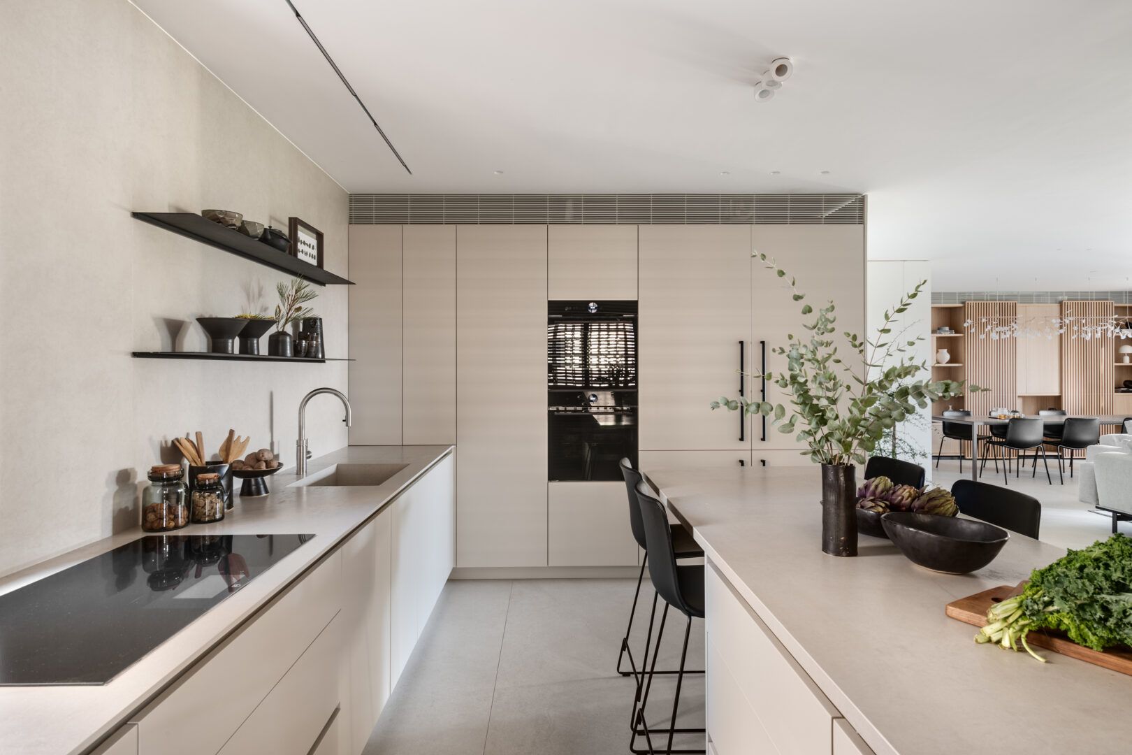 אולם מעבר לבחירות החומריות, לסטייל ולשפה האסתטית, ליבת התכנון נשענת על תפיסת אחסון חכמה וניהול יומיומי שקט. כל ארון, מגירה ונישה תוכננו בהתאם לשימוש בפועל – כך שהבית מתפקד כמערכת מדויקת, המאפשרת סדר, נוחות וזרימה טבעית בין החללים.
