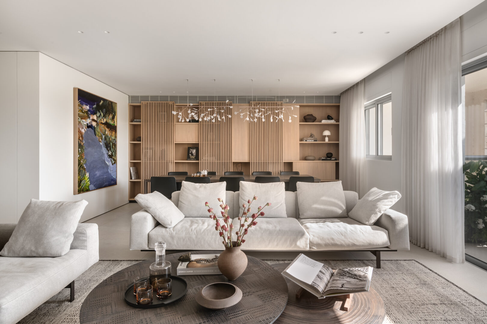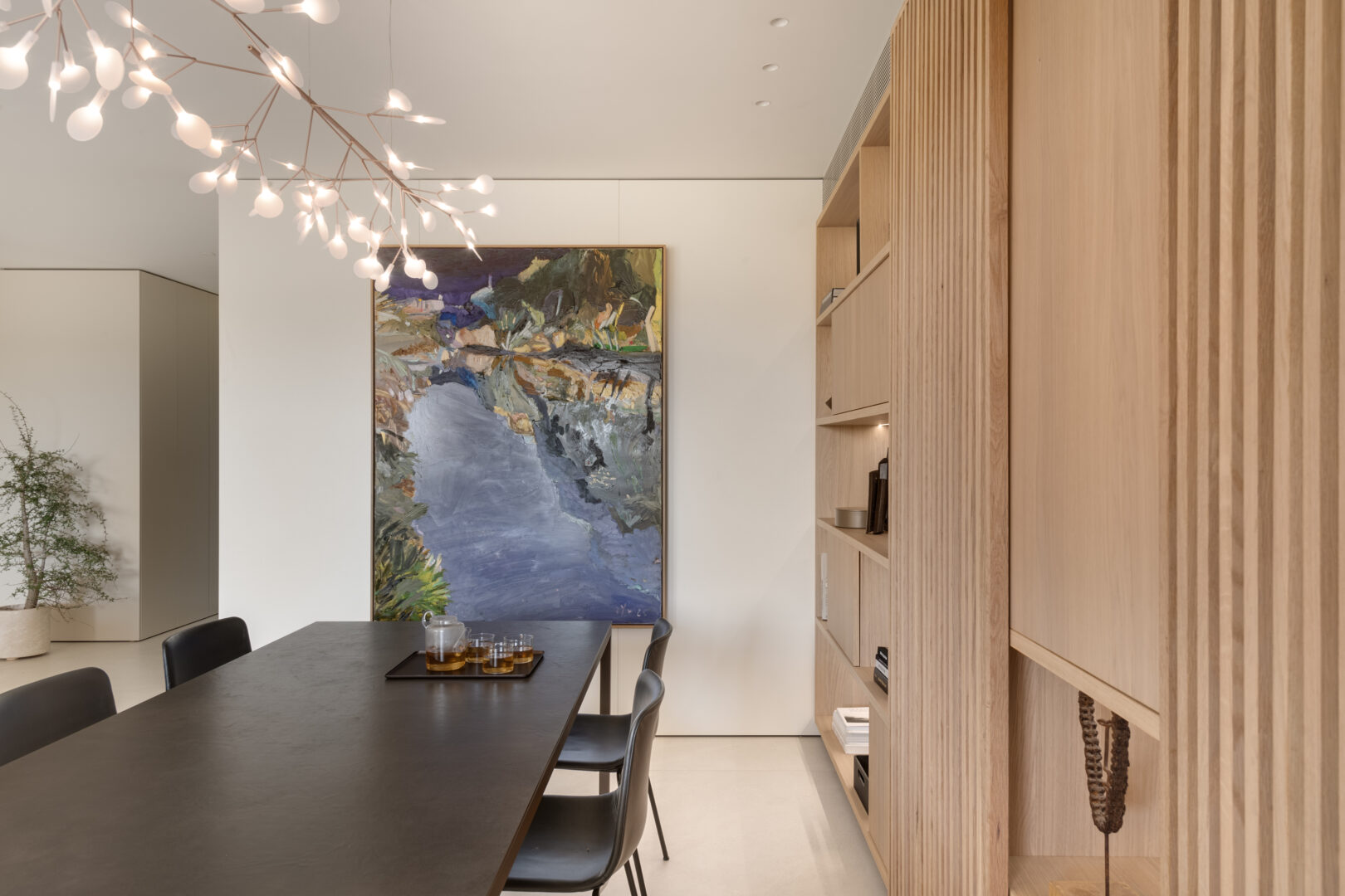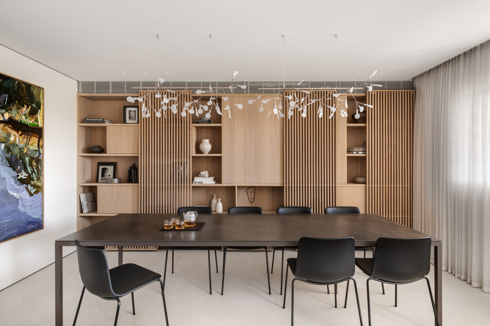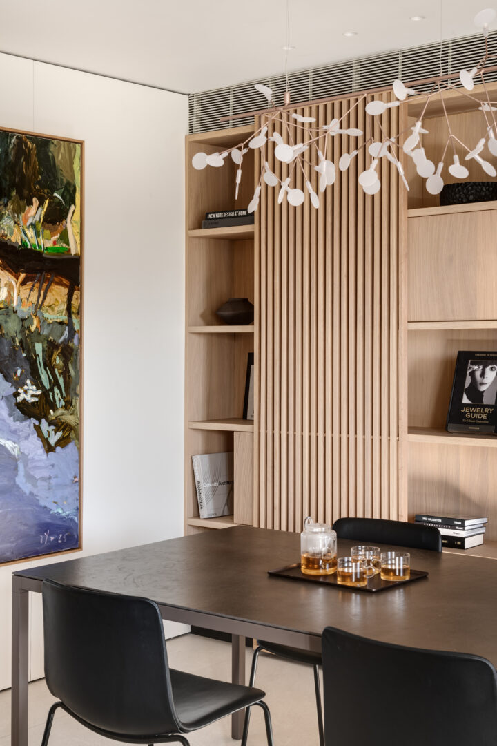 אזור פינת האוכל הפך לאחד העוגנים המשמעותיים בבית. שולחן אוכל באורך של שלושה מטרים מאפשר לארח בנוחות משפחה גדולה, ולצדו תוכננה כוורת נגרות רחבה, המשמשת כקיר תצוגה לאמנות, לפריטי נוי ולתמונות משפחתיות. בתוך הכוורת שובצה גם יצירה של האמן בועז נוי, אשר לדבריה של קופרמן “פותחת חלון נוסף בתוך הבית” ומוסיפה עומק רגשי למרחב הציבורי.
