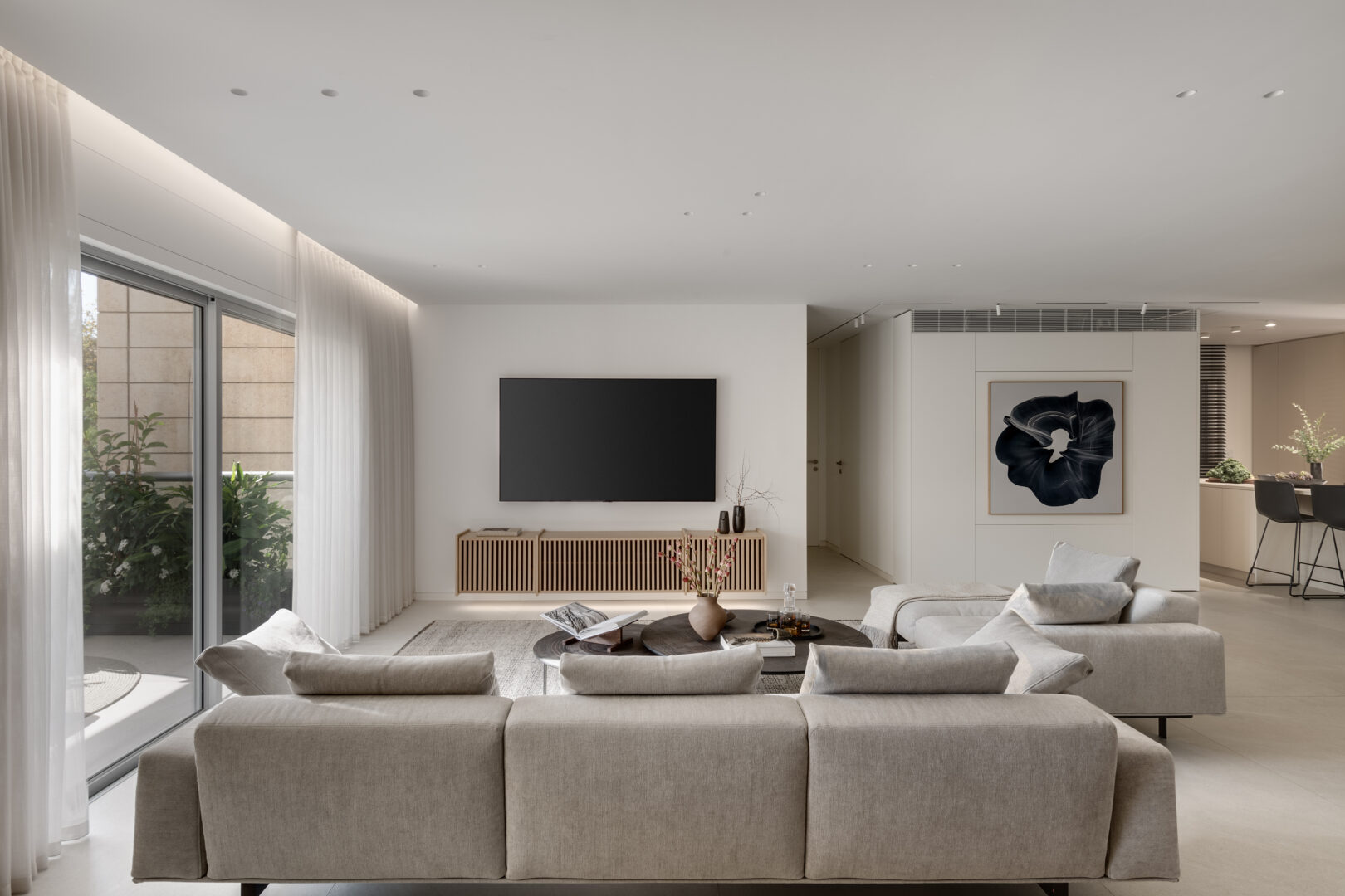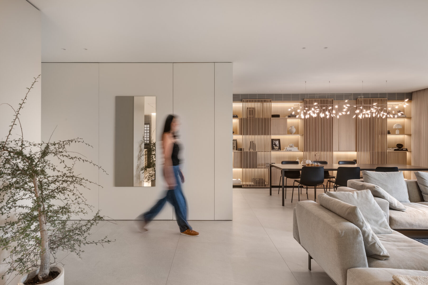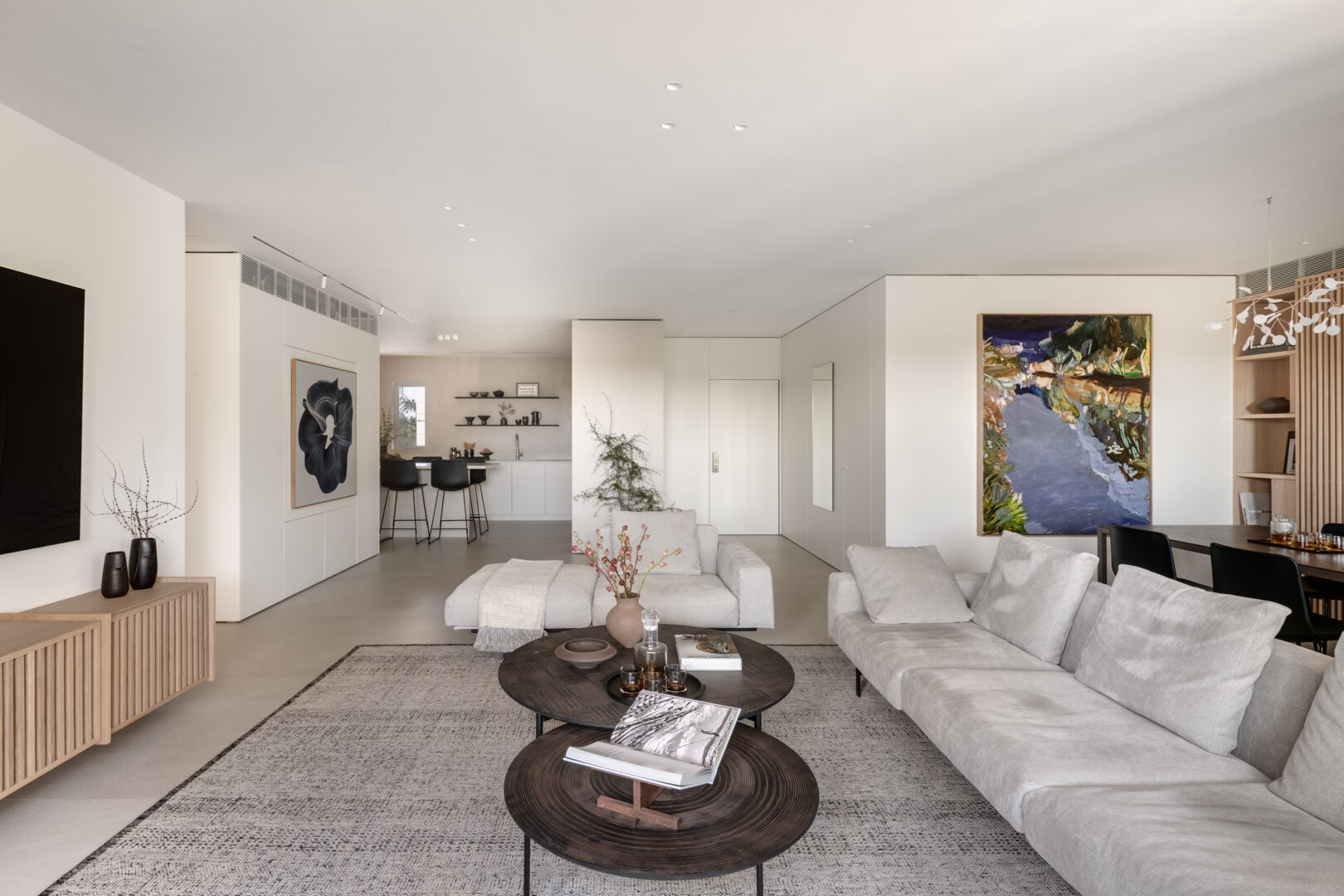 המהלך המרכזי בפרויקט היה שינוי מוחלט של חלוקת הדירה. דירת חמישה וחצי חדרים פורקה ונבנתה מחדש כדירת שלושה וחצי חדרים, עם אזור אירוח רחב ומואר, שתוכנן במפורש לאירוח משפחתי רב משתתפים. חדר הכביסה בוטל לחלוטין, ובמקומו הורחב המטבח ונוצרה נגרות ייעודית המשלבת את מכונת הכביסה באופן נסתר. כך הצליחה קופרמן להגדיל את שטחי העבודה והאחסון במטבח, מבלי לפגוע בניקיון החזותי של החלל.