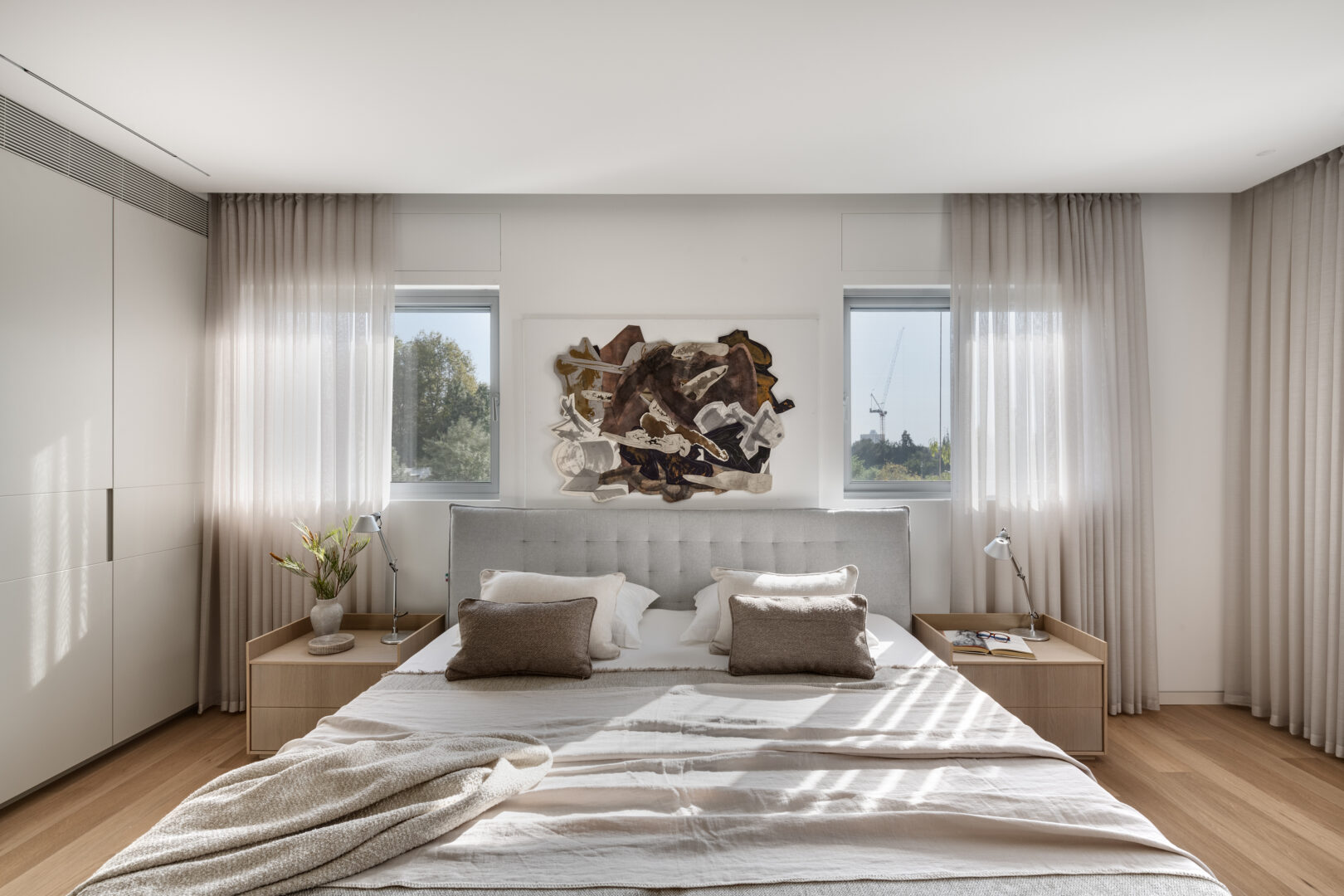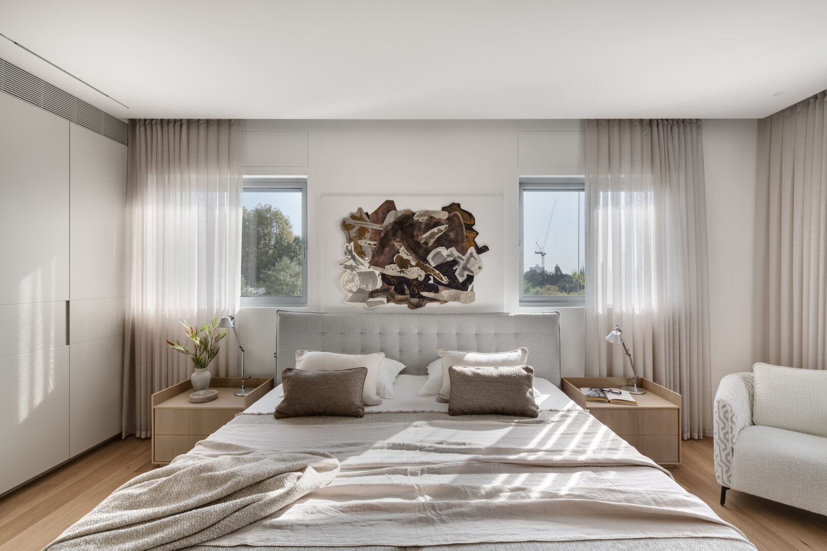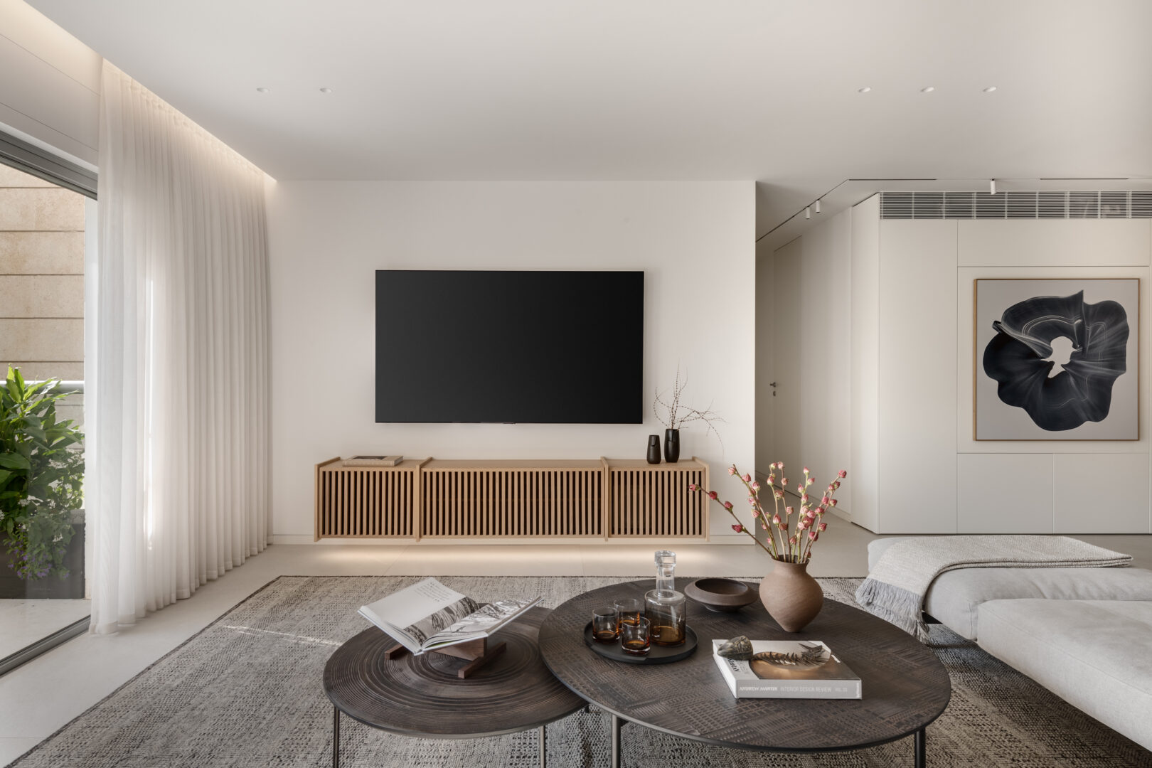 במרכז הבית תוכנן ארון נגרות גדול, שבתוכו מוסתרת יחידת המיזוג המרכזית. מעליו נתלתה יצירה של האמנית מרים כבסה, והאזור כולו זכה לכינוי “ארון האמנות”. סביבו שובצה תאורה היקפית, שמדגישה את החיבור בין תכנון טכני לאובייקט אמנותי והופכת אזור פונקציונלי לנקודת עניין מרכזית בבית.