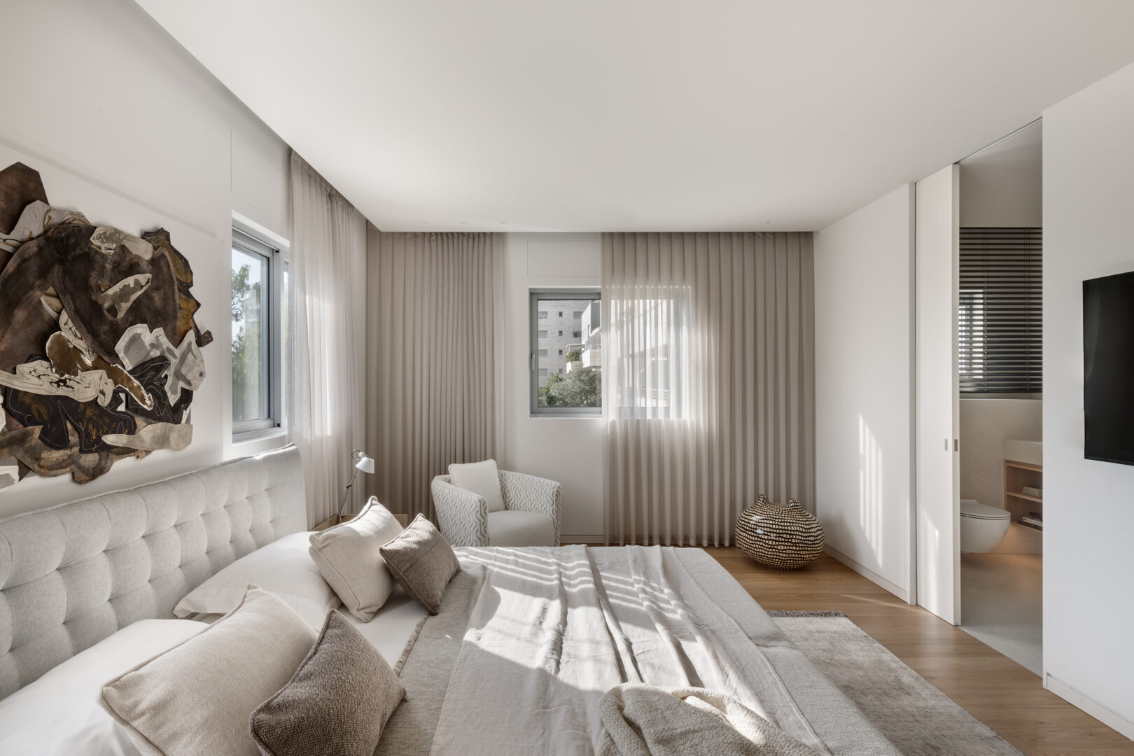 בצד הפרטי של הדירה תוכננה סוויטת הורים רחבת ידיים, הכוללת חיבור ישיר בין חדר השינה לחדר הרחצה באמצעות מחיצת זכוכית גלית ומדפי נירוסטה פתוחים, היוצרים תחושת המשכיות ורוך בין הפונקציות. לצידה נבנו חדר נכדים ייעודי וחדר שירותי אורחים הכולל גם אמבטיה – פתרון פרקטי המאפשר אירוח נוח של הדור הצעיר, מבלי לפגוע בשגרת היומיום של בני הזוג.