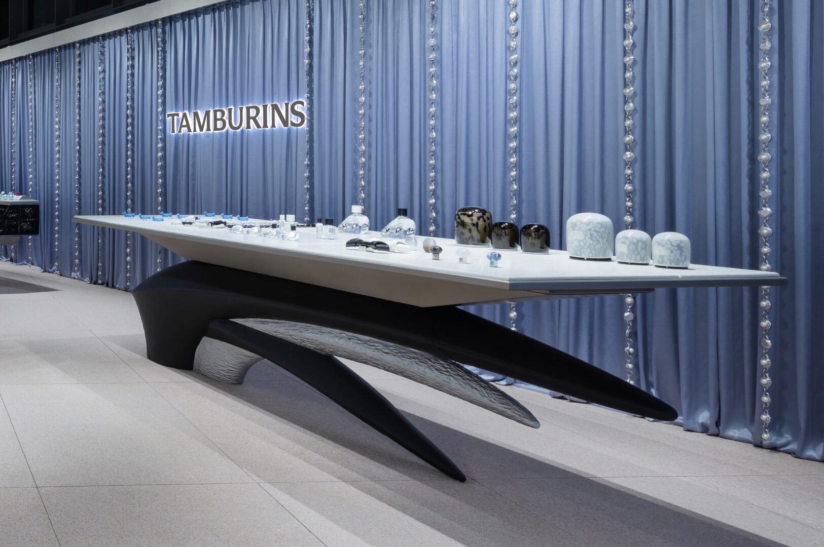 הגישה הרב־מותגית אינה מתפקדת כמרכז קניות טיפוסי, אלא ככוריאוגרפיה מרחבית מורכבת, שבה כל אזור מייצר אטמוספירה אחרת. במרכז החלל ניצב מבנה א-סימטרי עצום ממדים, היוצר ניגוד אדריכלי דרמטי בתוך הפנים. הסמל המזוהה עם קולקציית Bold של Gentle Monster משובץ בדפוסים מורכבים ברחבי החלל, ומשולב באדריכלות עצמה – לא כאלמנט גרפי בלבד, אלא כחלק אינטגרלי מהמרחב.