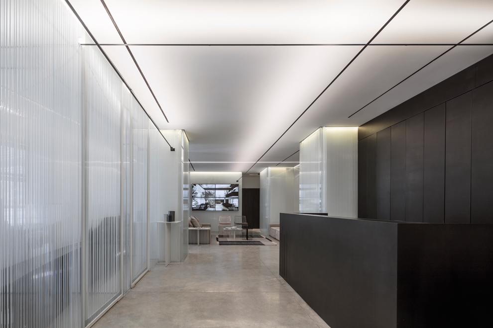 היות ובמסגרת הפרוגרמה נתבקשנו לשמור על פתיחות במשרד וקשר עין בין עובדי המקום, היה ברור שזכוכית היא החומר לטיפול בחלל. חיפשנו את הדרך להפוך את הזכוכית לאלמנט בעל משמעות במרחב אלמנט שיעניק מימד נוסף מעבר להיותו חוצץ בין חדרים, ויעצים את החוויה – בחנו פורמטים שונים של יישום זכוכית בחיפושנו אחר איכויות אופטיות שייצרו תמונות משתנות של אור, צללים מעניינים של דמויות ומבטים עם עומק. וכך מצאנו שחתך הזכוכית מהווה מעין פריזמה המשמשת לשבירת והחזרת קרני אור ולעתים גם לפירוק האור, וזהו הפתרון בו בחרנו.