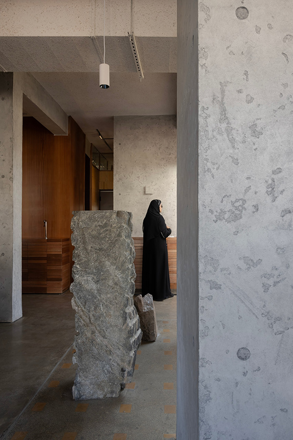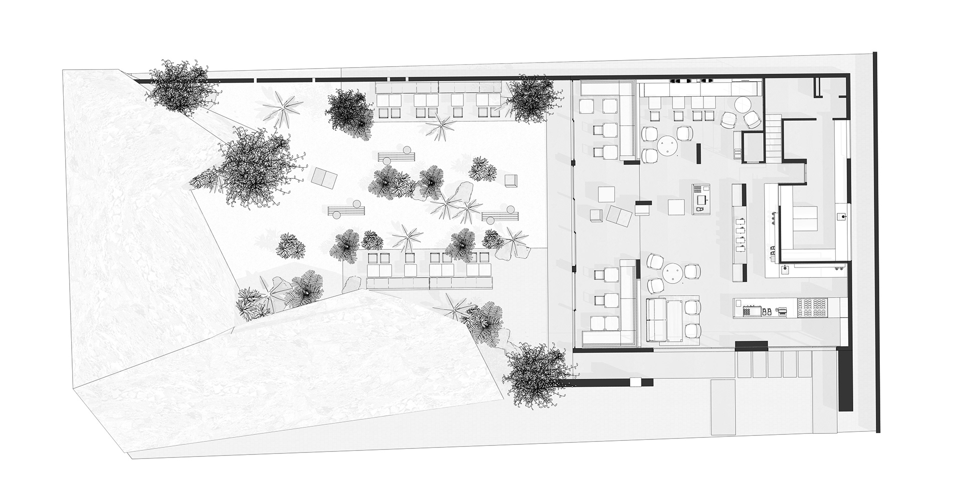 חלק מהסלע נחצב בעדינות ליצירת חצר פנימית אינטימית, ובה עצים ואור טבעי, המשמשת כמרכז החוויה המרחבית. חלונות פנורמיים מחברים בין הפנים לחוץ ומטשטשים את הגבול בין אדריכלות לנוף. אבני הסלע שנותרו מהחציבה שולבו מחדש כאלמנטים פיסוליים־שימושיים – שולחנות עמידה קצרים הממשיכים את הסיפור החומרי של המקום.